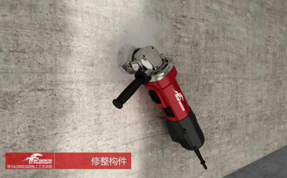 1.1.混凝土面应凿除粉饰层,油垢、污物,然后用角磨机打磨除去1-2mm厚表层,较大凹陷处用找平胶修补平整,打磨完毕用压缩空气吹净浮尘,最后用棉布沾丙酮拭净表面,待粘贴面完全干燥后备用。