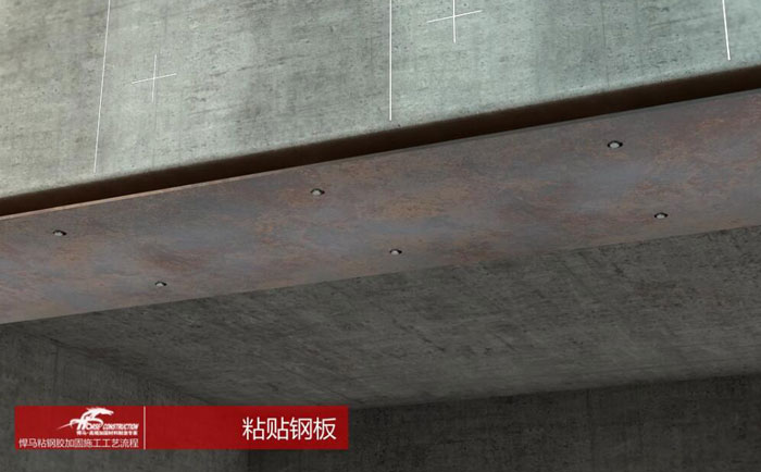 9.1、将钢材粘贴到混凝土表面,粘贴到位后,立即用夹具或支撑固定,并加压,使胶从钢材边缘挤出,同时要不断清理挤出的胶。