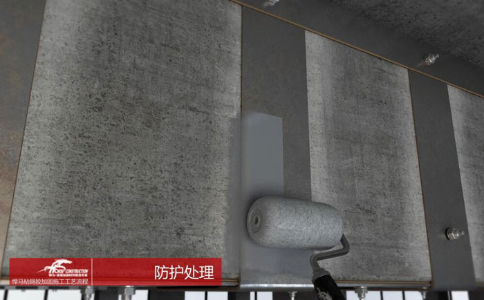 加固后钢板宜采用20mm厚M15水泥砂浆抹面保护,也可采用涂防锈漆保护,以避免钢材的腐蚀。