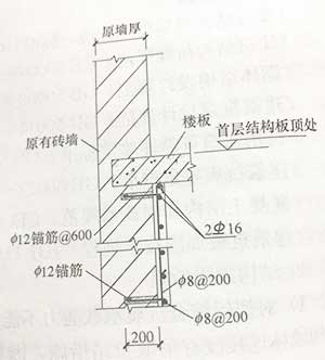 (4)单面钢筋混凝土板墙用Ф12L形锚筋与原砖墙拉结。