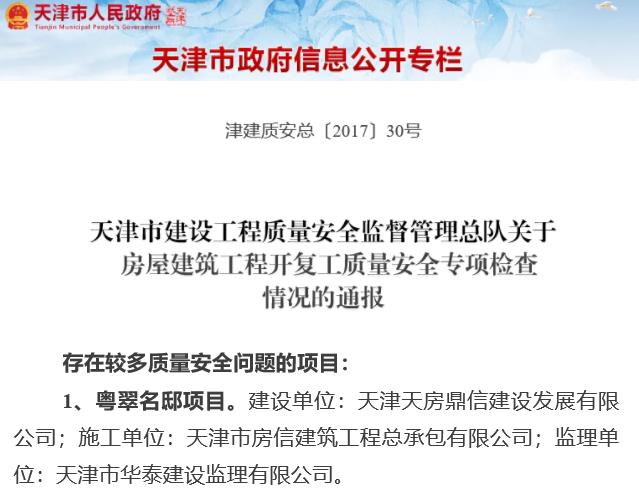 据悉,今年4月,天津市城乡建设委员会对粤翠名邸存在的质量问题进行处理情况通报:该项目个别栋号存在混凝土强度不符合设计要求的质量问题。因此,天津天房鼎信建设发展有限公司作为建设单位没有认真履行质量管理职责,给予该公司全市通报批评。