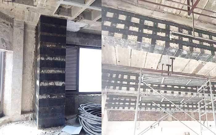 粘贴碳纤维布和粘钢加固法是利用树脂类胶结材料将碳纤维布或钢板粘贴于结构表面,并与结构形成整体受力体系,增强被加固结构的抗弯或抗剪能力,从而达到对结构加固补强及改善结构受力性能的目的。