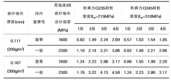 粘贴1~4层碳纤维布与钢板等强换算结果见表1。 从表1中数据分析可得: (1)1层碳纤维布折算Q235钢板厚度0.83~1.79mm,折算Q345钢板厚度0.57~1.24mm;当结构补强所需面积较小,1层碳纤维布满足结构承载力需要时,推荐选用碳纤维布加固方案,经济性和可操作性优势明显,此时选用粘钢加固法将大幅度增加工程造价和施工工期。