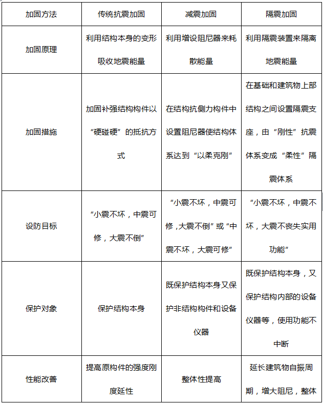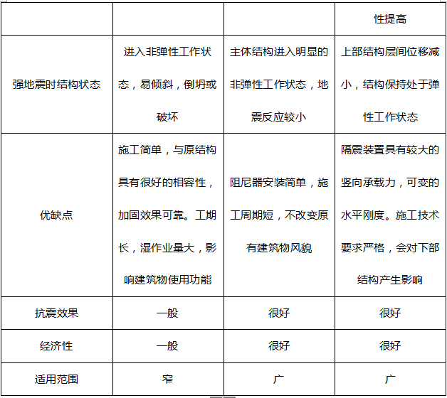新型抗震加固是在传统抗震加固基础上进行相关的革新,它在一定的范围内解决了传统抗震加固技术的弊端。通过对抗震加固技术方面的研究现状和工程实例的综述,将传统与新型抗震加固技术( 减震加固、隔震加固) 从安全性、合理性及经济性等方面进行对比分析,总结出下表所示。