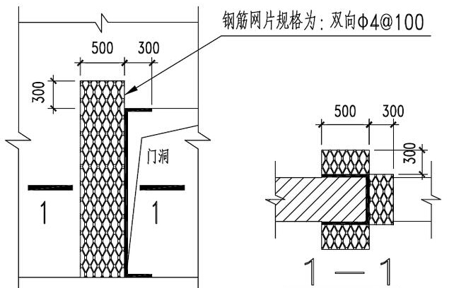 所有墙的门、窗框二侧(有构造柱时例外),应用钢板网等加固。除与墙身钉牢外,其上下端各弯转300。当门窗洞净宽2100时,两侧应设置钢筋混凝土构造柱。