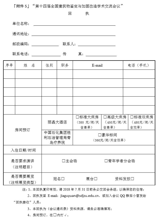2、入住酒店:青岛市丽晶大酒店,中国石化集团胜利石油管理局青岛疗养 院,费用自理。标准详见附件 5 参会回执。由于历届会议人数众多,会议期间 为青岛旅游旺季,为确保合理的住宿安排,请认真详细填写回执,并务必于 2018 年 7 月 31 日前将回执盖章扫描件发至 E-mail:jiaguyuan@sdjzu.edu.cn 或传真 至 0531-86993042,有回执的代表将优先安排住宿。