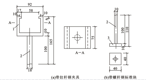 G.2.3 试件夹具应由带拉杆的钢夹套与带螺杆的钢标准块构成,且应以45号碳钢制作。其形状及主要尺寸如图G.2.3所示。