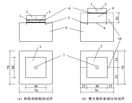 2 以结构用聚合物改性水泥砂浆为粘结材料的试件应由混凝土试块(图G.3.1–1)、结构界面胶(剂)涂布层、现浇的聚合物改性水泥砂浆层及钢标准块相互粘合而成(图G.3.1–2,b)。