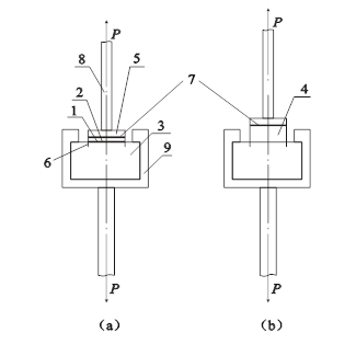 5–钢标准块6–混凝土试块预切缝 7–快固化高强胶粘剂的胶缝 8–传力螺杆 9–钢夹具