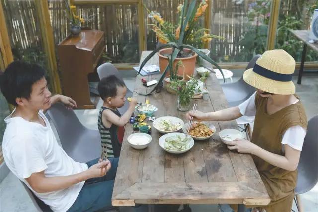 7月,傍晚的成都,暑热还没有褪去。三圣乡驸马联合5组的一座精致小院里,黄葛树、香樟树、拐枣树都长得很茂盛,俨然一个浓缩的树林。一家人坐在老旧门板改造的餐桌前吃饭。
