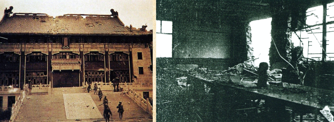 1937年8月,战火弥漫。在那段岁月里,绿瓦大楼被轰炸、被占领,饱受凌辱——大楼北侧孙中山铜像被推倒;墙壁上被日本侵略者写下了“占领”字样;东侧门楣上的石雕被切割下来运至日本,成为宫崎县一座所谓“和平塔”的一块基石......