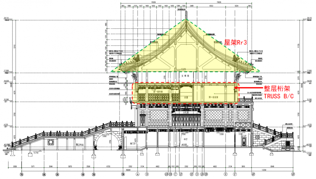 不考虑地震作用,结构承载力验算表明,大楼大部分柱、梁、楼板、承重砖墙、桁架、屋架及地基基础承载力能满足国家相关规范要求。但按7度、丙类抗震、后续使用年限为30年的要求对大楼抗震验算表明,目前大楼抗震性能不能满足国家现行规范对A类建筑的要求,需要在不破坏文物的情况下,采取措施以提高房屋整体抗震性能。此外,主楼及翼楼还存在钢筋锈胀渗水、彩绘脱落、取暖通风等不符合国家现行规范的情况。根据检测结果,施工人员按照国家相关标准,对大楼进行瓦片更换,彩绘恢复,给排水、电力、暖通、消防系统更新,防水、防潮系统完善,结构补强、加固,白蚁防治和周边环境整治等修缮工作。