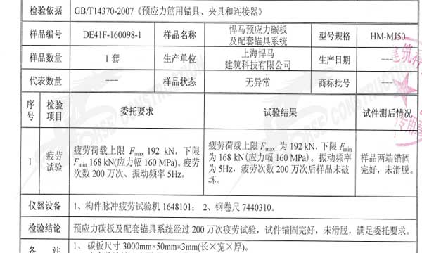 试验结果显示:悍马预应力碳板及配套锚具系统经过200万次疲劳试验,试件锚固完好,未滑脱。