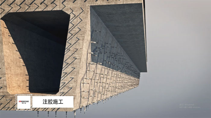 注胶工艺:若宽度为0.05~1.5mm,深度不超过300mm时,宜用定压注射器注胶;当裂缝宽度大于0.5mm且走向蜿蜒曲折时宜采用机控压力注胶。