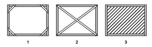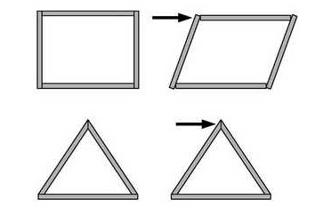 我们都知道,与三角形相比,矩形不是一个稳定的结构,很容易在外力作用下变成平行四边形。比如上面图片中,用四根木条做成一个画框,在水平外力作用下,这个画框很容易就变形成平行四边形。而三角形的画框就没有这个问题。但是,我们很少见到三角形的画框,我们也很少见到三角形剖面的房子。由于我们对建筑空间的需求,普遍意义上,矩形是最合适的形式,三角形剖面的房子无论是空间观感还是使用体验都比不上我们早已习惯了的矩形小房间。如何才能让这个四边形画框具有抵抗水平外力的能力呢?如何能够让这个四边形画框不会变成平行四边形呢?