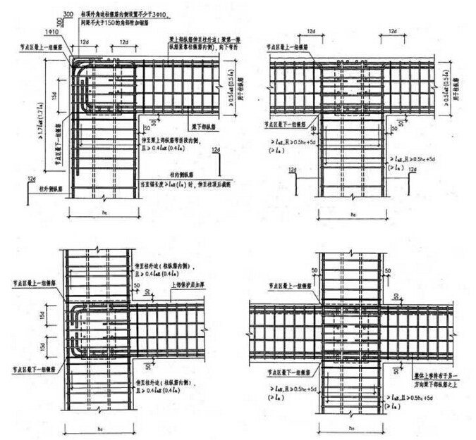 上面的图片表示了几种常见的节点钢筋锚固形式。这些锚固形式的目的,就是要起到那个加固小木片的作用,让框架梁和框架柱保持刚性连接,保持足够的节点承载力。