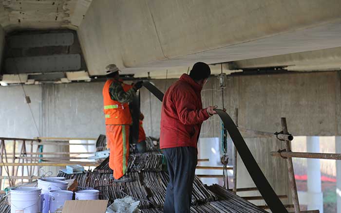 ②粘贴纤维法:它是利用树脂类粘结材料将纤维布(片材)粘贴于混凝土表面,利用其良好的抗拉性能达到结构修补加强的目的。