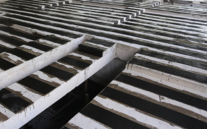 在楼板加固中,我们选择采用碳纤维布加固法。碳纤维布是一种新型材料,在楼板碳纤维布加固中,是通过在梁的受拉一侧粘贴碳纤维布提高梁和楼板的承载力实现,碳纤维布的作用是相当于增加了钢筋的受拉面积。约束了楼板和梁的裂缝扩张,提高整个楼板的荷载。
