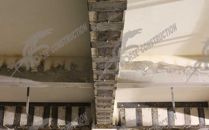 还有就是本身方法的缺陷,两种不同材料的共同工作问题,规范虽然作了滞后效应的考虑,但实际当中加上施工的误差,材料本身的差异,理论跟现实是有较大出入的。且加固规范要求此法在加固时不能超过原构件承载力的40%,另现场施工时还要注意防火问题。
