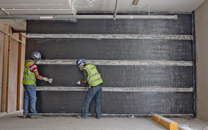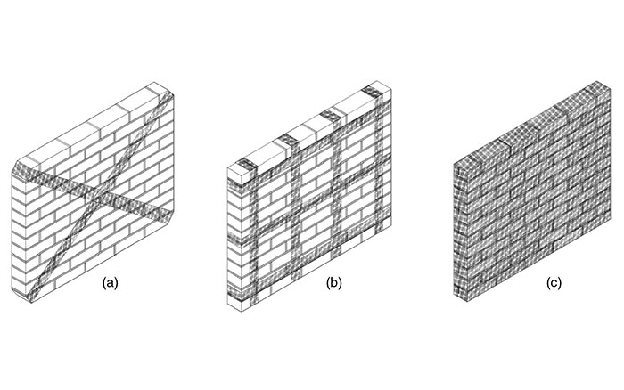 墙面粘贴纤维增强复合材料方法。纤维增强复合材料具有轻质、高强、耐腐蚀等优点,是较理想的新型复合材料。常用的纤维增强复合材料编织成布的有碳纤维布、玄武岩纤维布和石英纤维及玻璃纤维布等,粘贴纤维布的方法还具有能对结构的不同部位和不同环境下的结构进行施工、受力均匀、不会造成应力集中、不占用建筑空间、施工工期较短、结构外观尺寸不会出现明显变化、修复加固效果明显等特点。