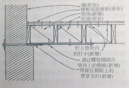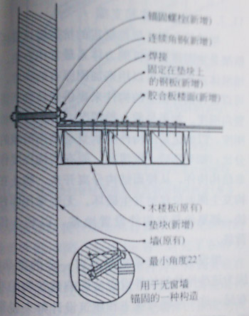 一种更好的连接构造是用角钢代替横木或其他别的连接构件,这种构造可以避免出现横向弯曲的问题,并对墙体提供足够的平面外锚固。例如图3的连接构造就出自《NEHRP已有建筑抗震加固手册》,在该构造中,在与墙体平行的托梁之间新加木垫块,通过螺栓把一个新增的钢板锚固在垫块的下侧。这些垫块需要用钉子固在原楼面板上,如果已经安装了新的胶合板楼妹胶合扳上即可。钢板通过一个钢支杆锚固在墙中。