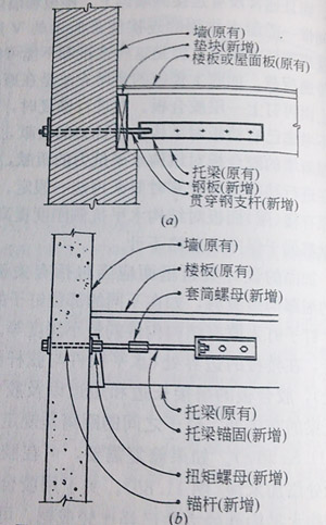 如果托梁与墙体垂直,钢板可以直接与托梁和墙体连接在一起,也采用其他一些连接构造,图4描述了两种在已有托梁侧面上的连接新钢支杆的方法。图4(a)中支杆与托梁上钢板焊接在一起,而钢板通过钉子、螺栓或螺钉和托梁联结在一起,这种连接明显的缺点是需要现场焊接,还需要使支杆的边缘和钢板, —条直线上。