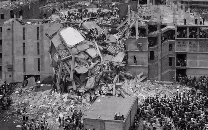 事故原因:整栋大楼第五层至第八层是未经允许而私自建造。建筑从原本的商业用途被用作了工业用途,重型机械的重量和振动加剧了建筑结构的过载。