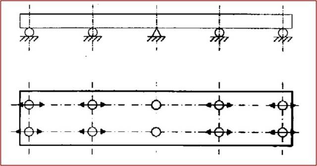 为避免梁的活动端伸缩量过大,固定支座宜布置在每联长度的靠中间支点处。但若该处墩身较高,则应考虑避开,或采取特殊措施,以避免该墩顶承受过大的水平力。