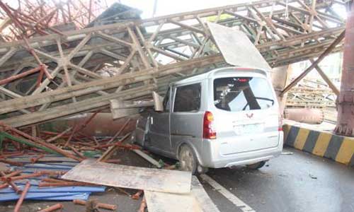 18日早6时许,武汉光谷大学园路处,一建设中的高架桥上的脚手架发生坍塌,一辆经过的面包车被压,车内5名伤者送往医院救治,其中1人抢救无效死亡,另外4人伤情稳定。