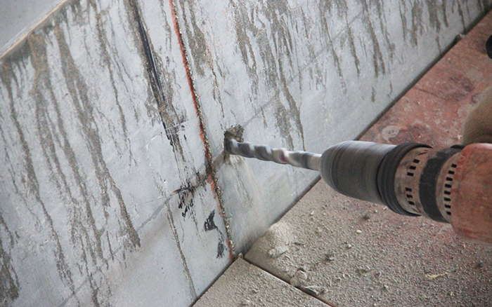 首先,按照技术参数规定钻孔。植筋位置应经放线并探测钢筋位置后标定。注意,在钻孔时应规避原钢筋位置,防止破坏原有钢筋混凝土结构。