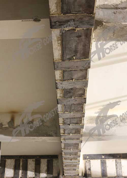碳纤维布加固:表面处理→底胶施工→找平施工→涂刷碳胶→粘贴碳布→二次滚涂→固化养护