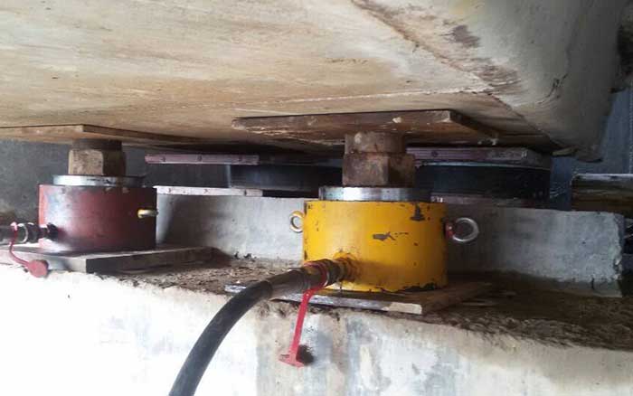 该桥在运营过程中,因为长期承受大吨位荷载作用导致引桥支座严重受损,2017年10月,该桥引桥在进行顶升支座更换时,为了保证支座更换过程中,桥梁支座垫石表面平整无缺点,及千斤顶预放位置的修复与整平,采用了上海悍马支座更换临时调平胶和支座垫石专用结构胶。