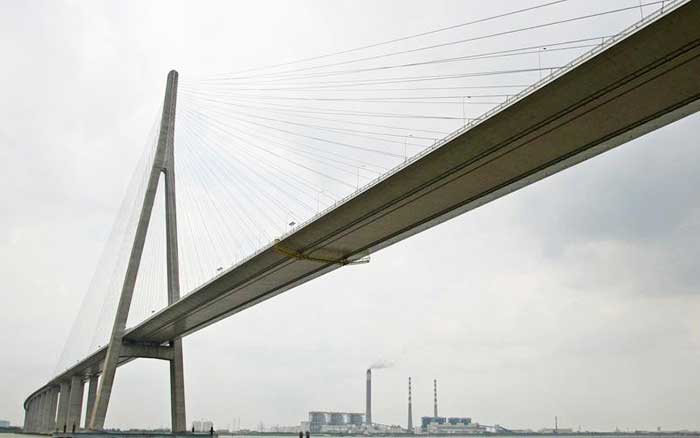 苏通大桥位于苏东部,连接南通市和苏州常熟市,工程路线全长32.4公里,由岸接线工程、跨大桥工程和南岸接线工程三部分组成。其中,接线长约15.1公里,南接线长约9.2公里,跨大桥长约8.2公里。