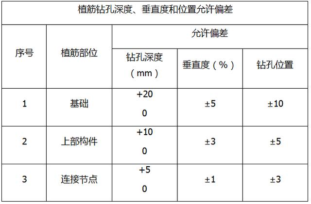 植筋孔施工完成,应按每种规格随机抽检5%,且不少于5个比例,对下表中涉及项进行实测。