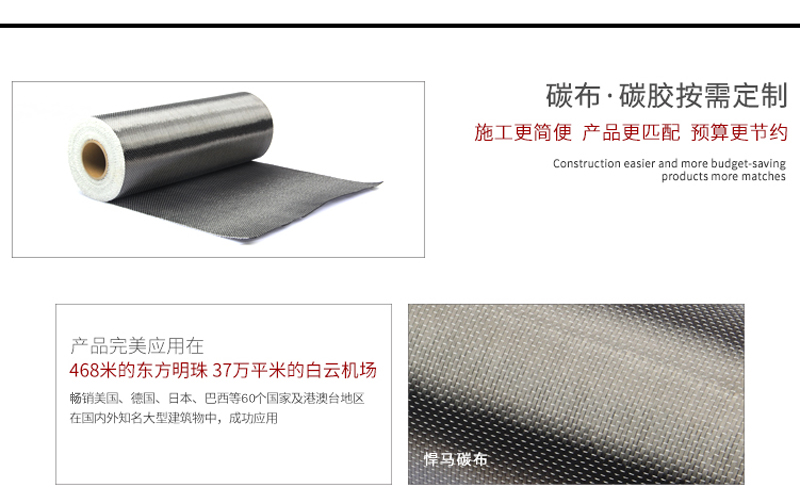 碳纤维布:采用碳纤维布需出具出厂合格证、国家权威机构出具的检测报告等。且应满足国家规范50728-2011对材料的要求: