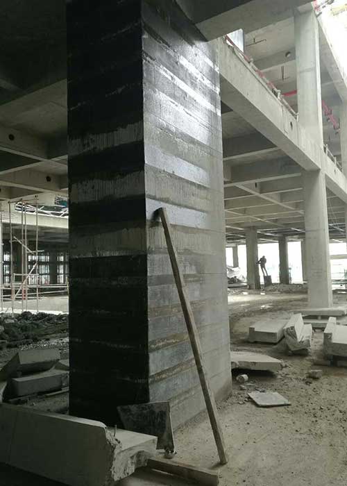 第二,如果是大面积的空鼓,直接把空鼓的地方割掉(注意被切掉部分需要凿毛),再采用修补胶修补平整,然后进行碳纤维布的粘贴,搭接时要至少搭接10公分以上;刮板在刮布时要来回滚压,确保空气完全排出;面胶要均匀涂刷。