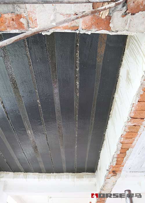 当砌体结构采用粘贴碳纤维加固的时候,需要将砌体结构表面缺点进行修补,然后在其墙、柱表面需先做一层水泥沙浆抹平层,层厚不应小于15mm且平整,水泥砂浆强度不应小于M10,待抹平层弯曲固化后,按照混凝土结构粘贴碳纤维布的方法来进行施工。