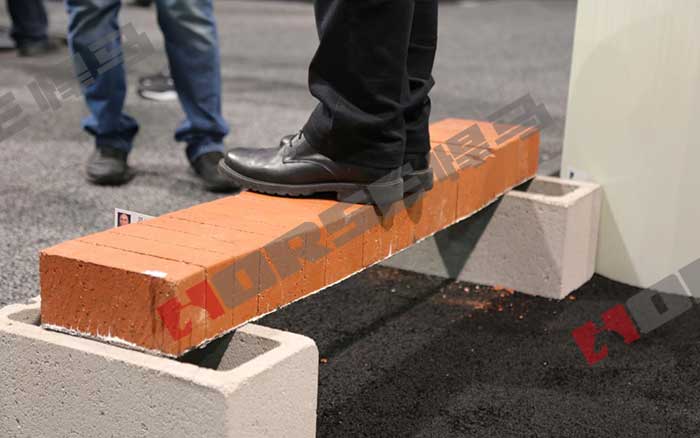 我们做了实验,在一排砖头下面粘贴碳纤维布,可以看到,碳纤维布固化后人站上去,结构是没有问题的。你肯定会惊讶:小小一块布就这么大能耐?