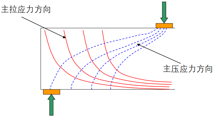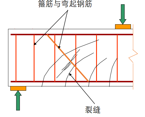 主要表现:为构件在应力作用点与支座反力点连线方向传递应力的过程中受剪承载力不足导致的延应力传递方向发展的裂缝。