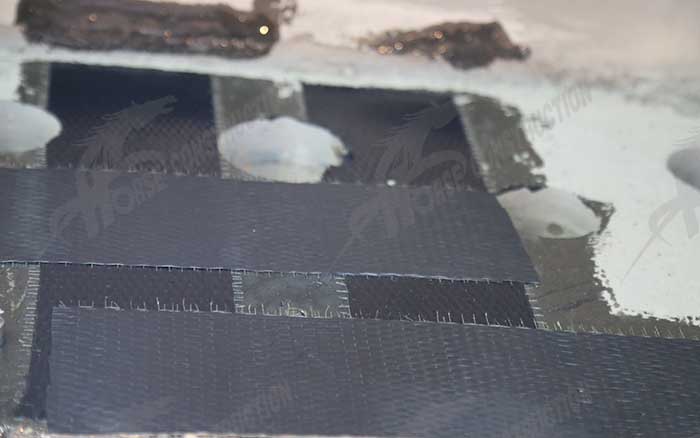 碳纤维布有着极高的抗拉强度,采用配套碳纤维胶使其黏贴在混凝土表面,代替裂缝处混凝土结构承受拉力。在修补混凝土裂缝时,所使用的碳纤维布必须与混凝土紧密粘贴,使碳纤维布所受的力传递到裂缝周边混凝土结构上,使其和混凝土结构形成一个整体,从而确保建筑的安全。