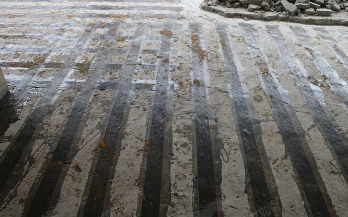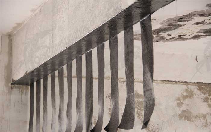 将碳纤维浸渍胶均匀涂抹于被粘贴部位,拐角部位适当多涂抹一些。将碳纤维布拉紧对齐后粘贴,用塑料刮板 或滚筒(用去掉外边绒毛的涂料滚筒即可),沿同一方向反复滚压,直至胶料渗出。然后在碳纤维布外表面也均匀涂抹浸渍胶,并反复滚压,使浸渍胶双向充分浸润碳纤维布。若多层粘贴,待手指触感干燥,可进行下一层粘贴。碳纤维布若需搭接,搭接长度不宜小于100mm。