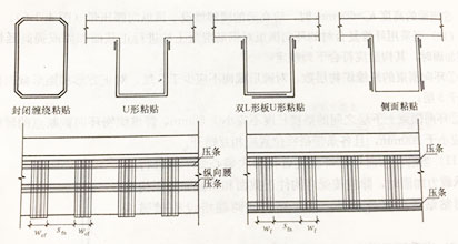 3.粘贴方式应优先采用锚固性能最好的封闭粘贴方式,四面全裹的加固效果是最好的。其次也可采用U形粘贴,侧面粘贴;当采用碳纤维板时,可采用双L形板粘贴形成U形粘贴。为了加强箍板的锚固性能,对U形粘贴和侧面粘贴方式应在箍板的末端加粘纵向压条,如下图。当梁高h≥600mm时,应在梁的腰部增设一道纵向腰压条。