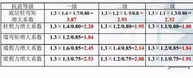 根据房屋建筑的重要性提高一度采取抗震措施时,针对不同构件规定地震力增大系数。以钢筋混凝土结构为例,仅地震内力就有如下提高(以静力为基数的增大系数):