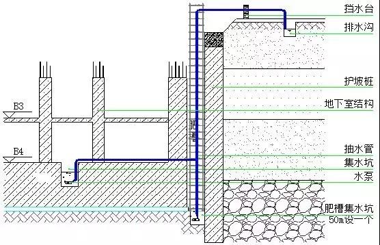 在肥槽内每50米设置集水坑一个,下雨时,在坑内放5台潜水泵(1台备用),将肥槽内的积水及时抽送至坑上的排水沟内。汇集到地下室集水坑内的雨水,同样用水泵抽到基坑外部的排水沟。利用场区内设置的沉淀池,将雨水经排水沟进入沉淀池沉淀后,再排入市政雨水管道。