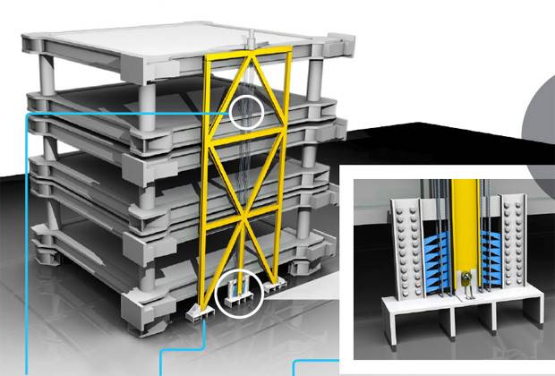 工程师将保险丝的逻辑应用到了建筑当中。钢架结构建筑物由于金属的特性本身具有一定的弹性,从而可以吸收一定程度的震动能量。除了钢结构之外,建筑工程师还将在整个建筑物从头到脚用垂直的可更换钢缆「缠紧」。这些钢缆就像皮筋一样,可以将整个结构受力。当地震发生时,钢缆可以吸收相当大一部分的动能,保持建筑物的结构端正。