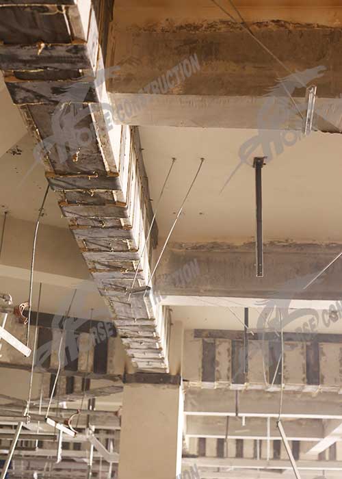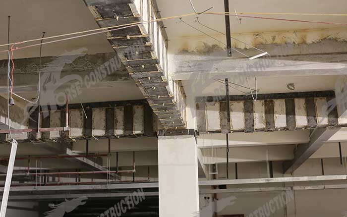 粘钢胶使用比较方便,一般是在构件、钢板清理完毕之后,开始搅拌粘钢胶,待搅拌均匀,无气泡,然后将粘钢胶同时涂刷在钢板和混凝土粘合面上,经检查无漏刷后即可将钢板与原构件混凝土粘贴;粘贴后的胶层平均厚度应控制在2mm~3mm。俯贴时,胶层宜中间厚,边缘薄;竖贴时,胶层宜上厚下薄;仰贴时,胶层宜中间厚,边缘薄。