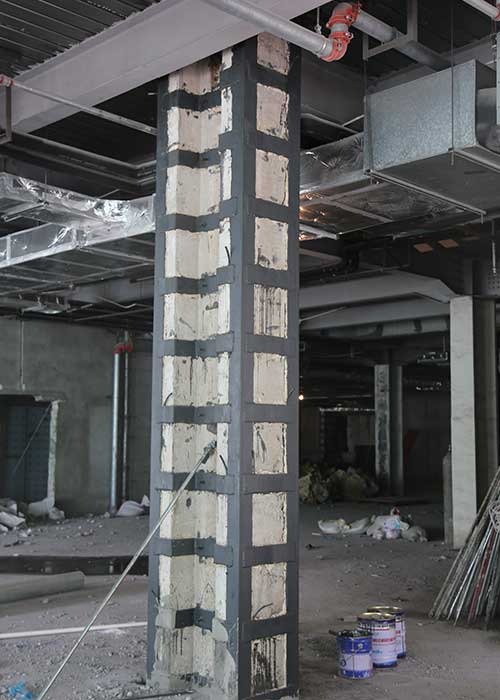 若须提高柱子承载力,同时要求构件截面尺寸不能增加很多时,可采用外包型钢加固法。加固后,混凝土柱不仅提高了承载力,由于柱的柱芯混凝土受到型钢套箍和缀板的约束,柱子也提高了延性。