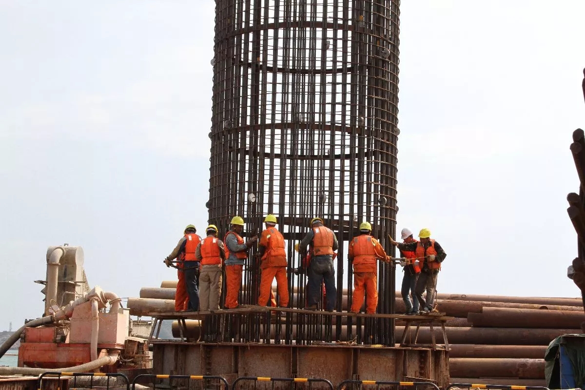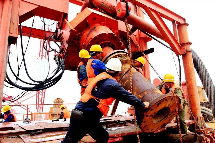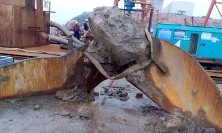 海底的光板岩不仅硬,而且倾角不一,附近可能还潜伏着大大小小的坚硬孤石,让人捉摸不定。所以在这样的海底每打一根桩都可能面临不同的情况,而这样的桩有1865根。