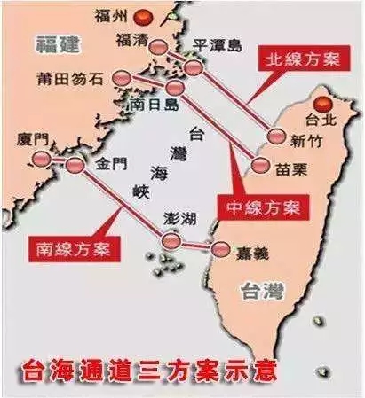 其实早有规划从北京到台湾修一条高速公路,高速铁路,只是原来兴许是个梦想,但今天的中国已有实力完成她。原来规划了北中南三条线路,如今选择了北线,就是先以大桥经平潭,然后以平潭为跳板通过修建125公里的隧道连通台湾。这是最短的一条线路。