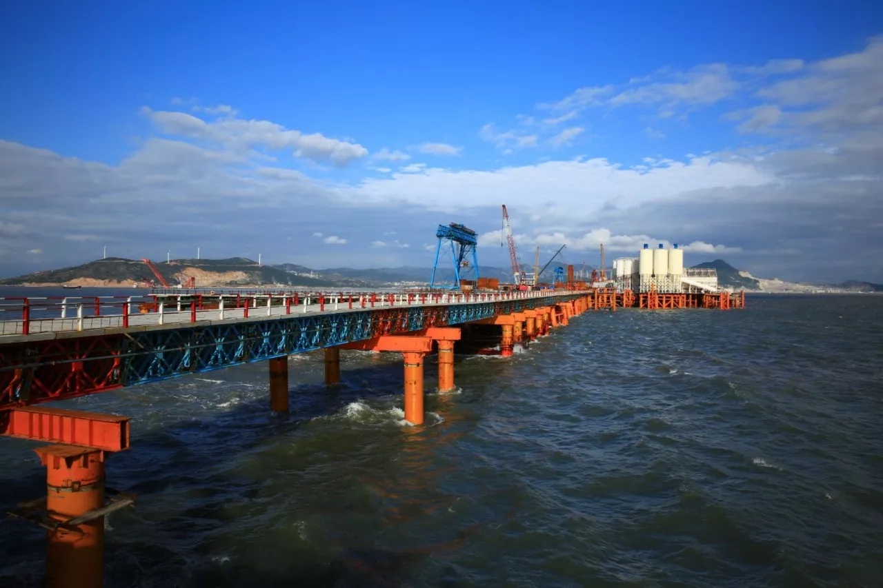 这是海上栈桥,只是临时工程,但是你可知道,托起钢桁梁的钢管桩,深深扎入的是40多米深的海底,托起的临时桥梁却可以抵御14级的台风,这座临时栈桥建设规模和难度都超过了许多桥梁。